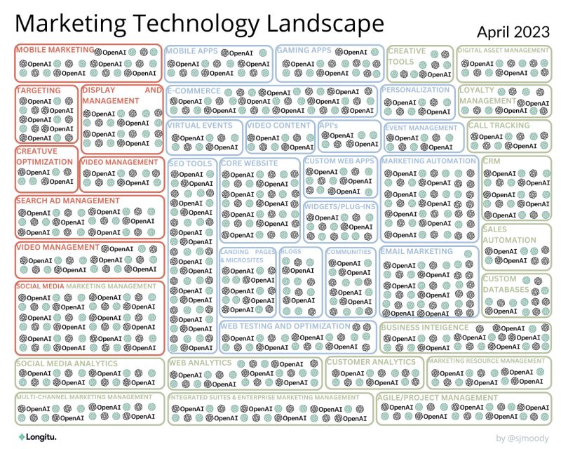 Steven Moody developed this brilliant illustration of AI’s impact on Marketing Technology. He’s right! AI will impact every aspect of MarTech and create new capabilities within marketing products. Some of those will be good, and others won’t work as expected.